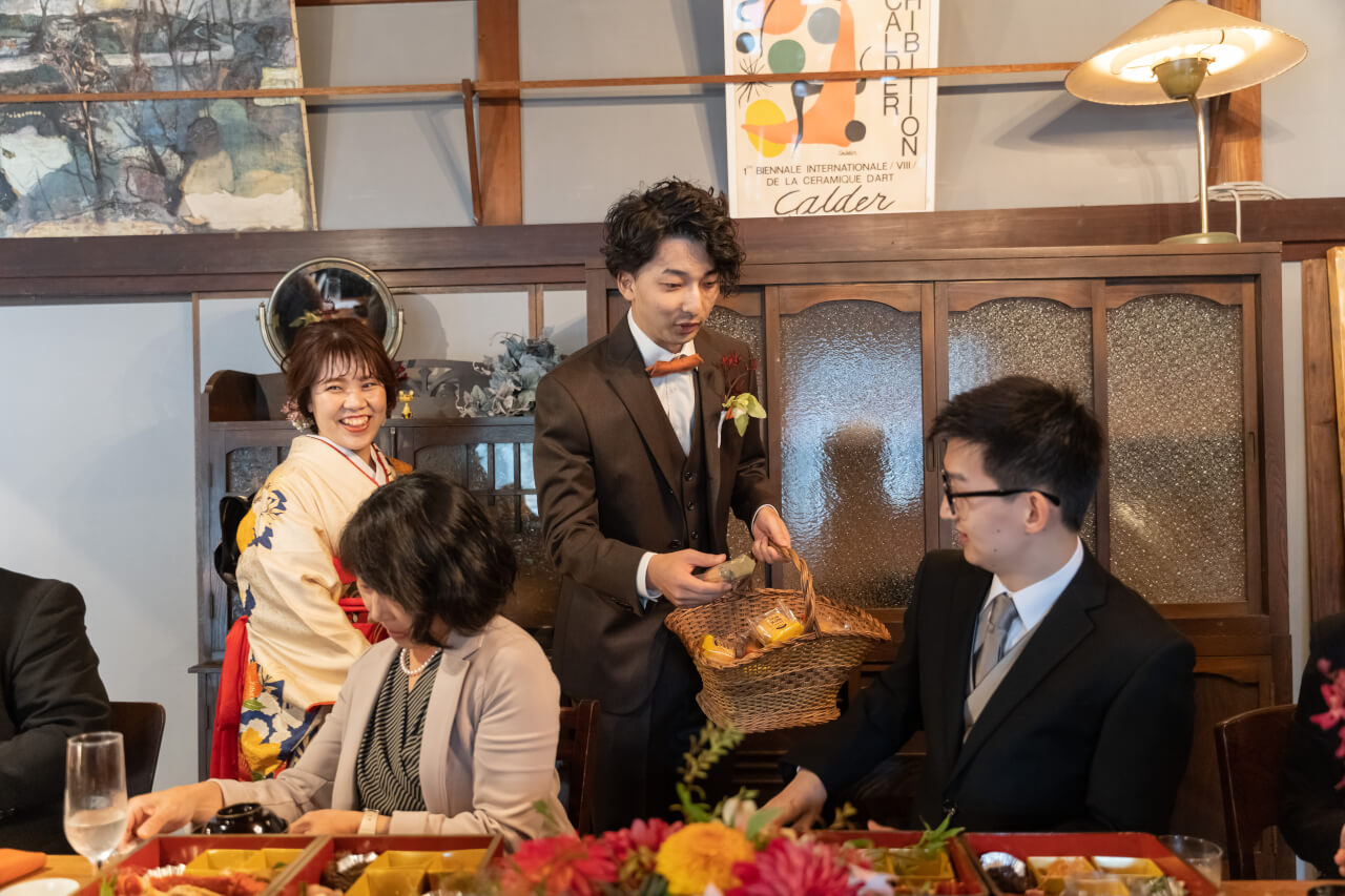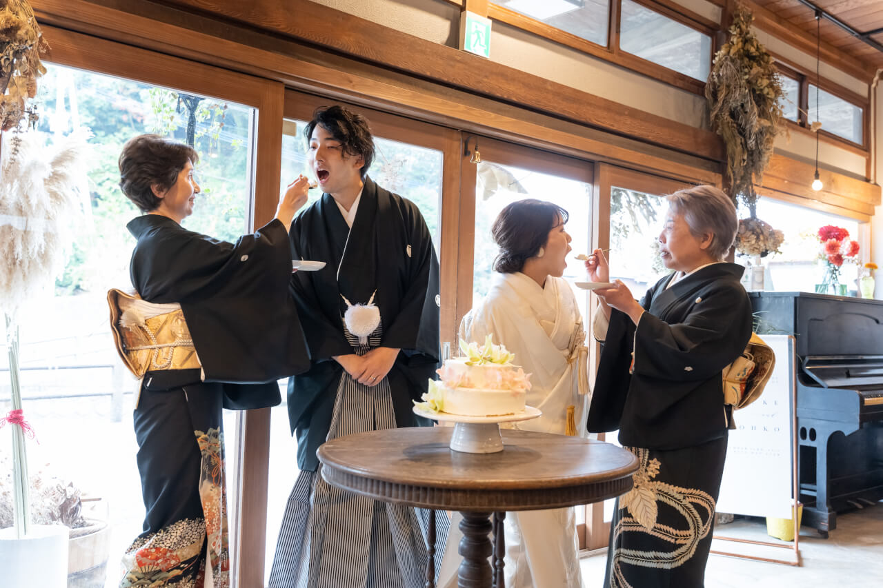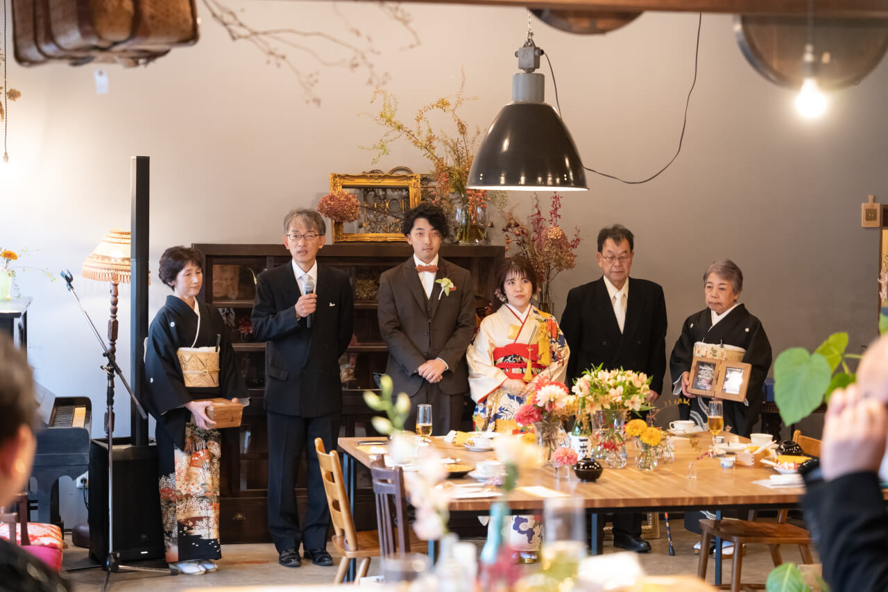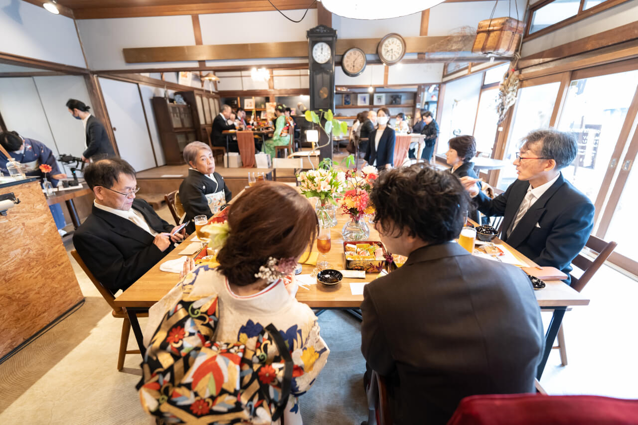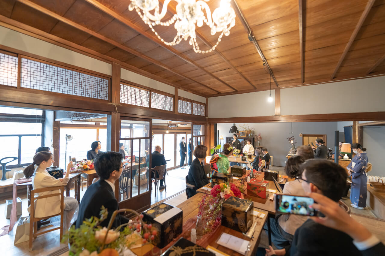1週目は、ご家族ご親族に囲まれて、古民家カフェで本格派のお重料理を楽しんだ和の結婚式。