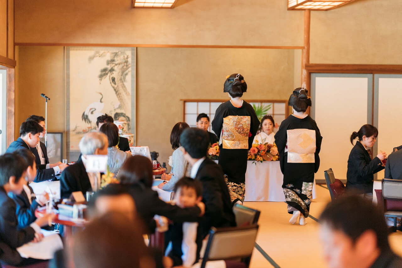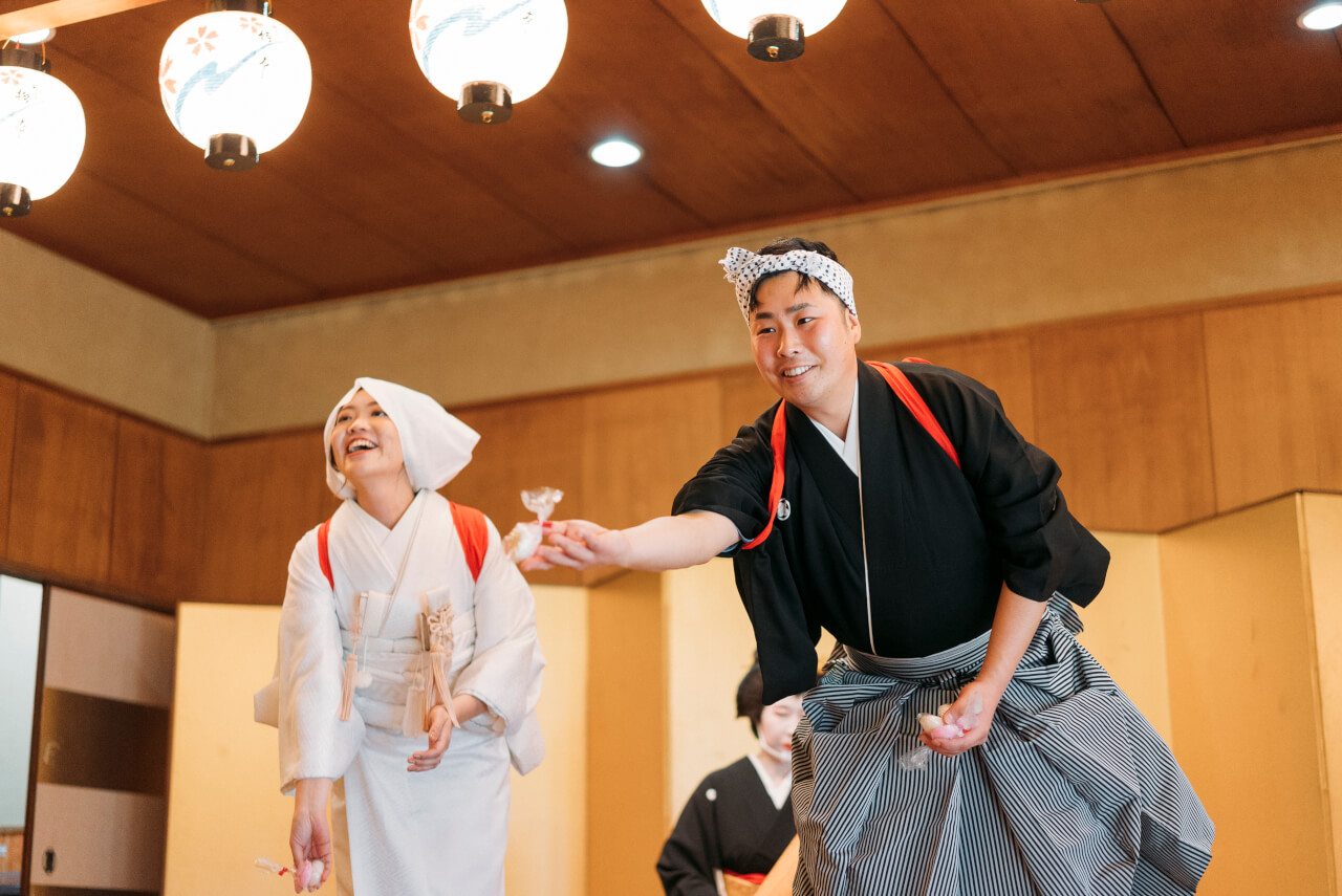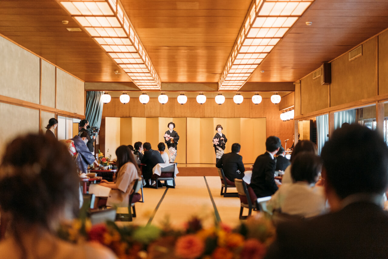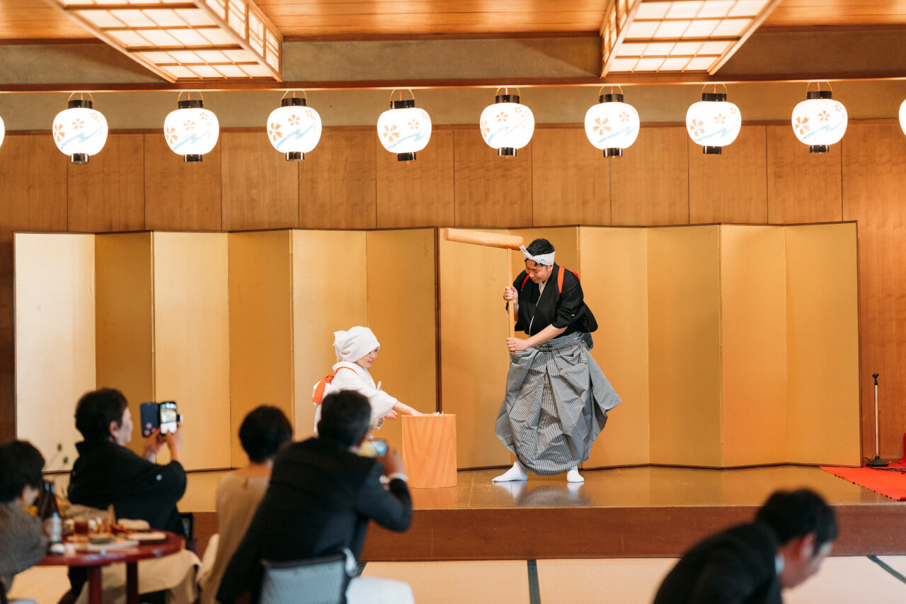 長崎検番さんのお座敷遊びに始まり、祝い樽での鏡開きなどを取り入れた、和の伝統をたいせつにした披露宴。