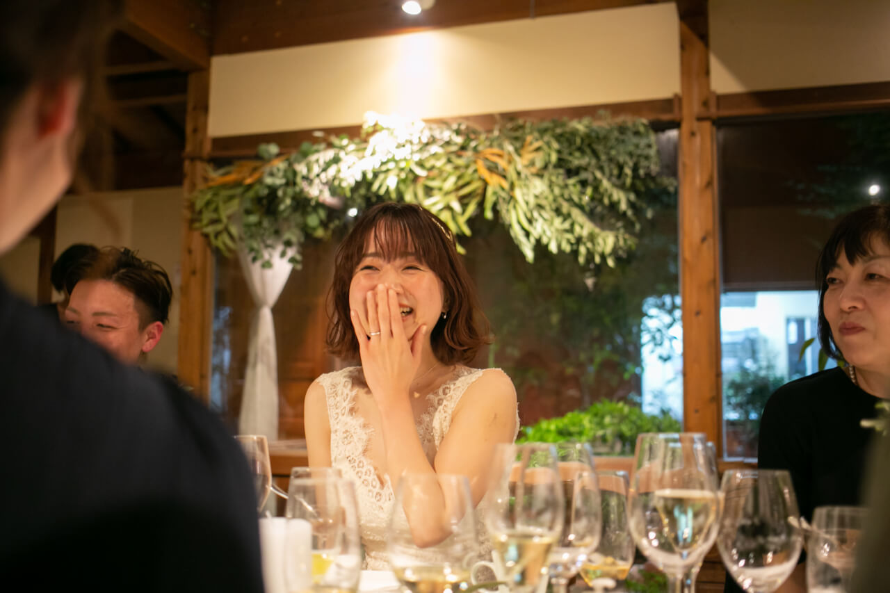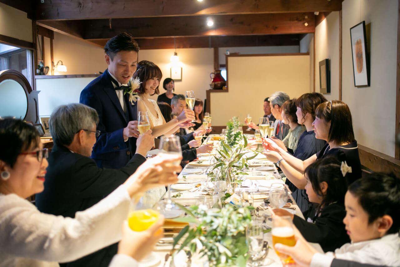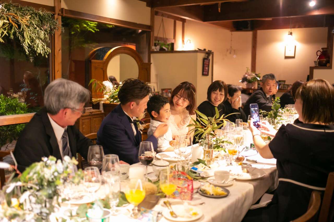 おいしいお料理で会話もはずみ、1つのテーブルを囲んでご両家でにぎやかに過ごした、ご家族だけの小さな結婚式。