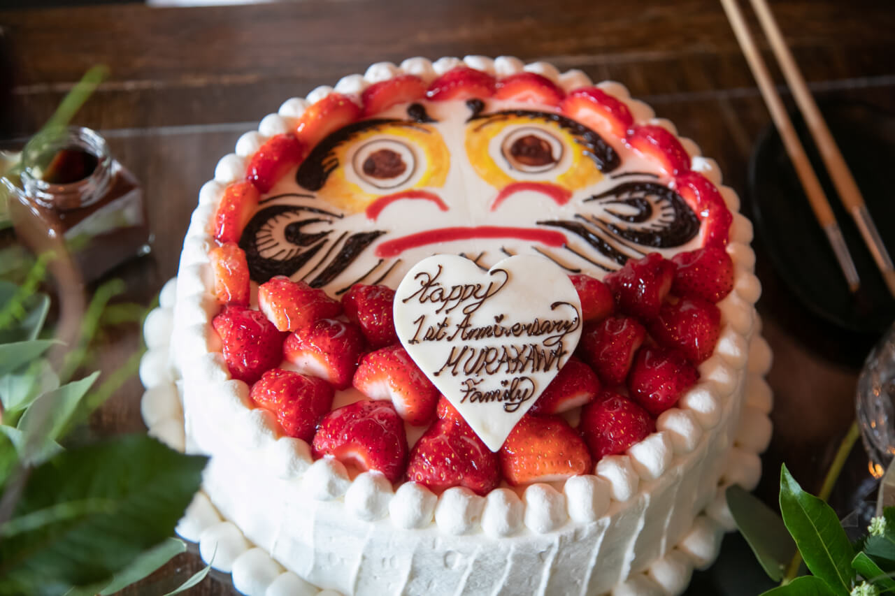 知人の方に依頼なさった会場の装花や、ヘアメイク、そしてだるまケーキも、ふたりへの祝福の気持ちに溢れていることがよくわかりました。